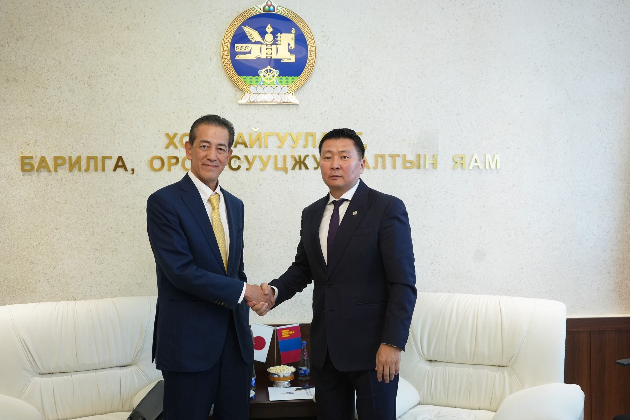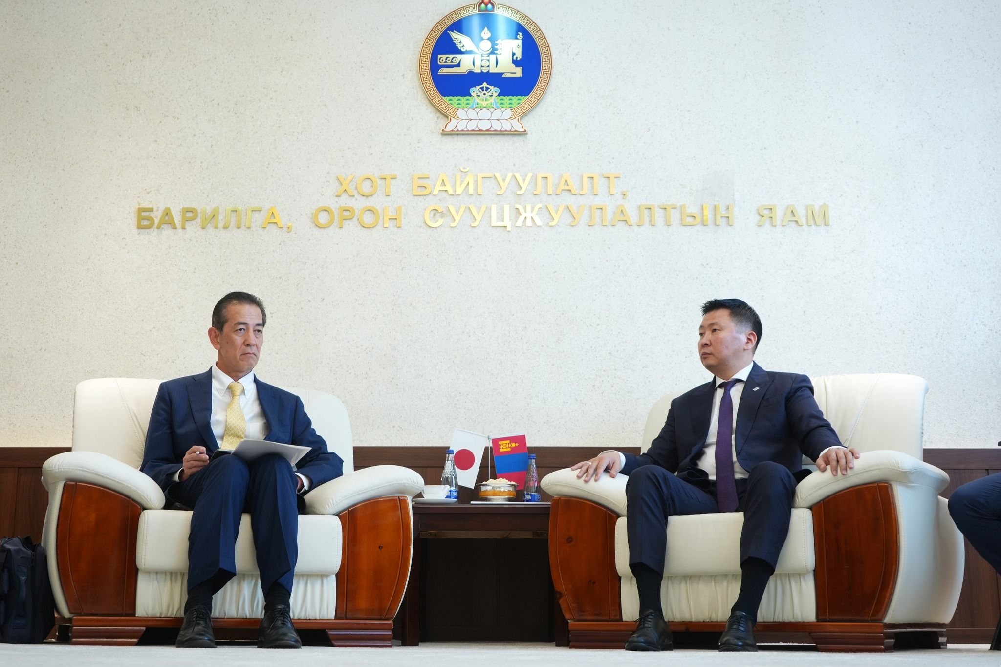 Хот байгуулалт, барилга, орон сууцжуулалтын сайд Э.Бат-Амгалан Япон Улсын Газар, дэд бүтэц, тээвэр, аялал жуулчлалын дэд сайд Огасавара Кэничиг хүлээн авч, уулзалтаар хоёр улсын хот байгуулалт, барилга, орон сууцжуулалтын салбарын хамтын ажиллагааг идэвхжүүлэх чиглэлд санал солилцов.