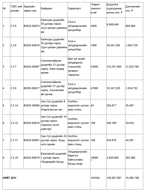 Дуудлага худалдаанд оролцогч бүртгүүлэх хүсэлтээ 2025 оны 09 дүгээр сарын 18-ны өдрийн 09:00 цагаас эхлэн 09 дүгээр сарын 24-ний өдрийн 15:00 цагийн хооронд газрын биржийн цахим систем WWW.MLE.MN-д илгээн баталгаажуулсан байна. ЖИЧ: Бусад мэдээллийг WWW.MLE.MN /ГАЗРЫН БИРЖИЙН ЦАХИМ СИСТЕМ/ болон WWW.LAND.UB.GOV.MN /НИЙСЛЭЛИЙН ГАЗАР ЗОХИОН БАЙГУУЛАЛТЫН АЛБА/ цахим хуудсанд хандан танилцаж, цахим дуудлага худалдаанд оролцохыг урьж байна. Дуудлага худалдааны байршлуудад АРХИТЕКТУР ТӨЛӨВЛӨЛТИЙН ДААЛГАВАР батлагдсан болно. Холбоо барих утас: 77771285, 80771285