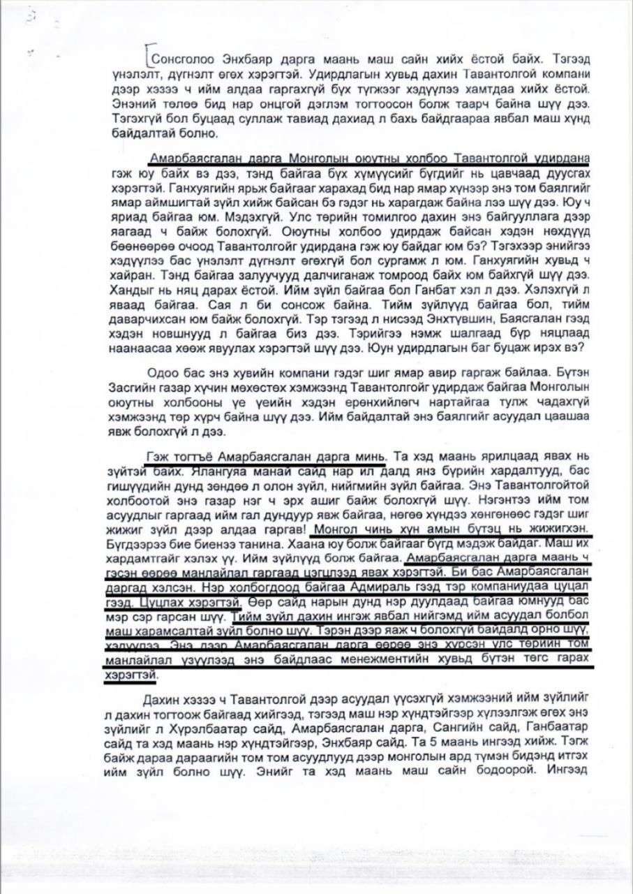 Тэгвэл УИХ-ын гишүүн Б.Энхбаяр өөрийн цахим хуудсаараа дамжуулан Ерөнхий сайд Л.Оюун-Эрдэнийн ЗГХЭГ-ын дарга Д.Амарбаясгаланд Админералтай холбоотой асуудлаа өөрөө шийд. Улс төрийн манлайлал гаргаад гэрээг цуцал гэж хэлж байсан Засгийн газрын хуралдааны тэмдэглэлийг дэлгэлээ.