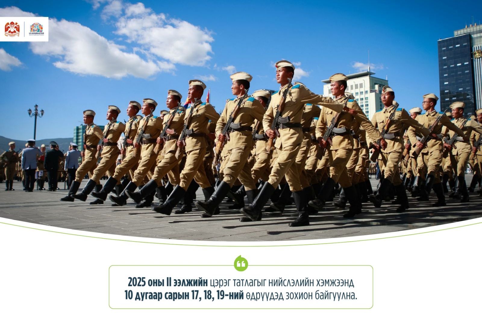 Нийслэлийн хэмжээнд 2025 оны II ээлжийн цэрэг татлагыг энэ сарын 17, 18, 19-ний өдөр зохион байгуулна. Мөн хугацаат цэргийн албанд тэнцсэн залуусаас санал авч мэргэжил эзэмшүүлнэ. Тодруулбал, барилгын засал, сантехникч, цахилгаанчин, гагнуурчин, үсчин, оёдолчин зэрэг мэргэжлийг эзэмших боломжтой. Харин тухайн мэргэжлээрээ ажиллаж байсан бол ахисан шатны сургалтад хамруулах аж.