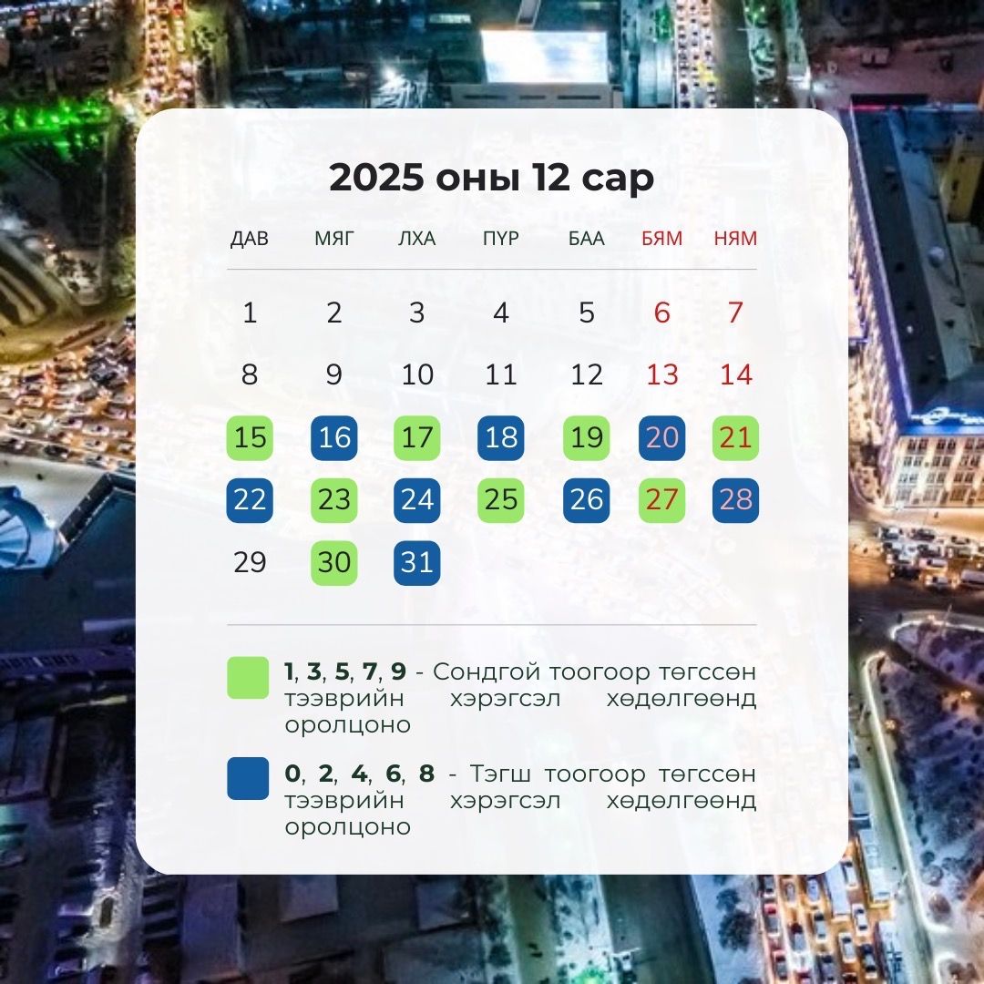 Шинэ жилийн баяр дөхсөнтэй холбоотойгоор томоохон зах, худалдааны төв болон гол гудамж замуудын хөдөлгөөний ачаалал эрс нэмэгдсэн. Үүнтэй холбоотойгоор иргэдээс автомашины улсын дугаарын тэгш, сондгойгоор зорчих хүсэлт иржээ. Тиймээс иргэдийн хүсэлтийн дагуу автомашины улсын дугаарын тэгш, сондгой хязгаарлалт хийх эсэх талаар санал авсан бөгөөд өнөөдөр дүн нь гарсан байна.