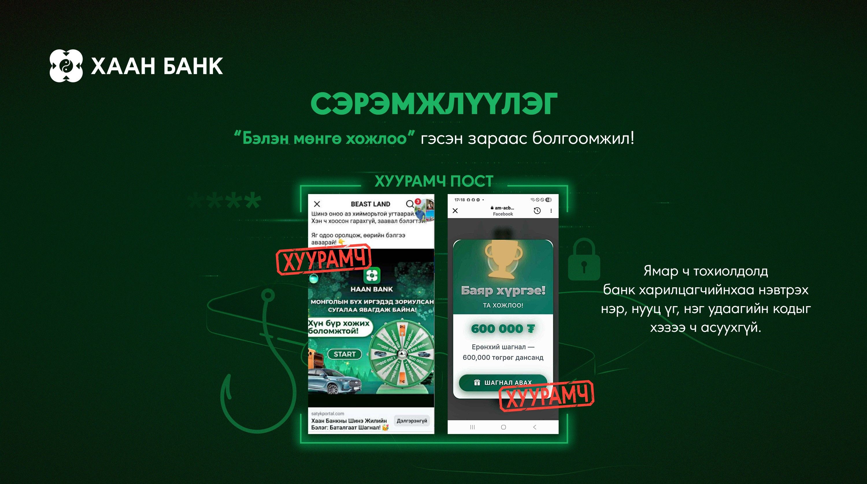 Санхүүгийн аливаа байгууллага харилцагчаас интернэт банкны нэвтрэх нэр, нууц үг, нэг удаагийн код асуудаггүй. Мөн баяр, тэмдэглэлт өдрүүдийн өмнө цахим залилангийн эрсдэл нэмэгдэх хандлагатай байдаг тул сэжигтэй линк, постод болгоомжтой хандаж, үл таних эх сурвалжаас ирсэн мэдээлэлд хариу өгөхгүй байхыг зөвлөж байна.
