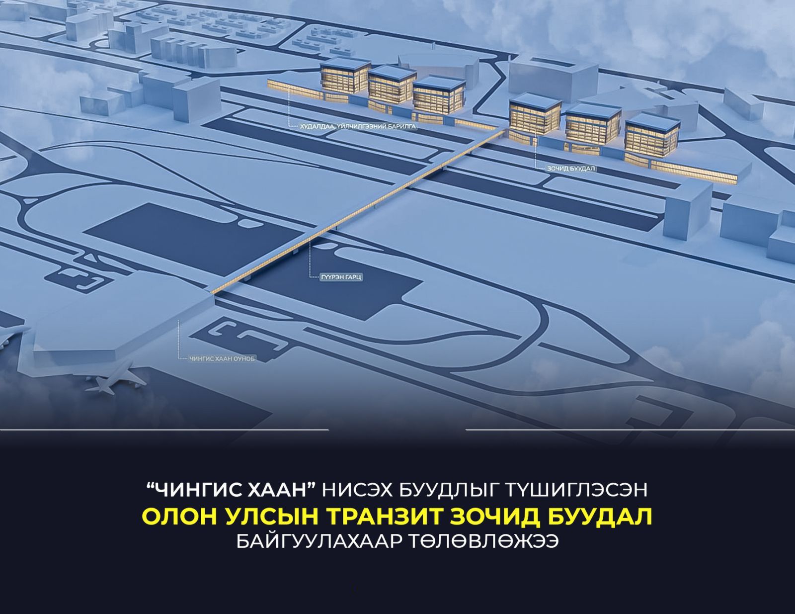 “Чингис хаан” олон улсын нисэх буудал нь 2025 онд нийт 45 мянган транзит зорчигч хүлээн авчээ. Нийслэлийн Засаг даргын нэгдүгээр орлогч Т.Даваадалай “Нисэх буудалд суурилсан “Аеротрополис” буюу дагуул хотыг хөгжүүлэх стратегийн зорилт, олон улсын транзит зочид буудал барих бодит эрэлт хэрэгцээнд тулгуурлан төслийг төр, хувийн хэвшлийн түншлэлээр барихаар төлөвлөж байна. Транзит зочид буудал ашиглалтад орсноор Монгол Улс Азийн бүс нутгийг холбосон агаарын тээврийн HUB болох боломжтой” гэдгийг онцоллоо. Тус транзит зочид буудлыг нийт 3.3 га талбайд барихаар төлөвлөж, худалдаа, үйлчилгээ, оффисын зориулалт бүхий иж бүрэн төлөвлөлттэй, 25 мянган м.кв талбайд таван давхар барилга барихаар зураг төслийг боловсруулжээ. Мөн зочид буудлыг “Чингис хаан” олон улсын нисэх буудалтай 350 метр урт бүхий хоолойгоор холбож, зорчигчдыг шууд хүлээн авах зохион байгуулалт хийхээр төлөвлөсөн байна.