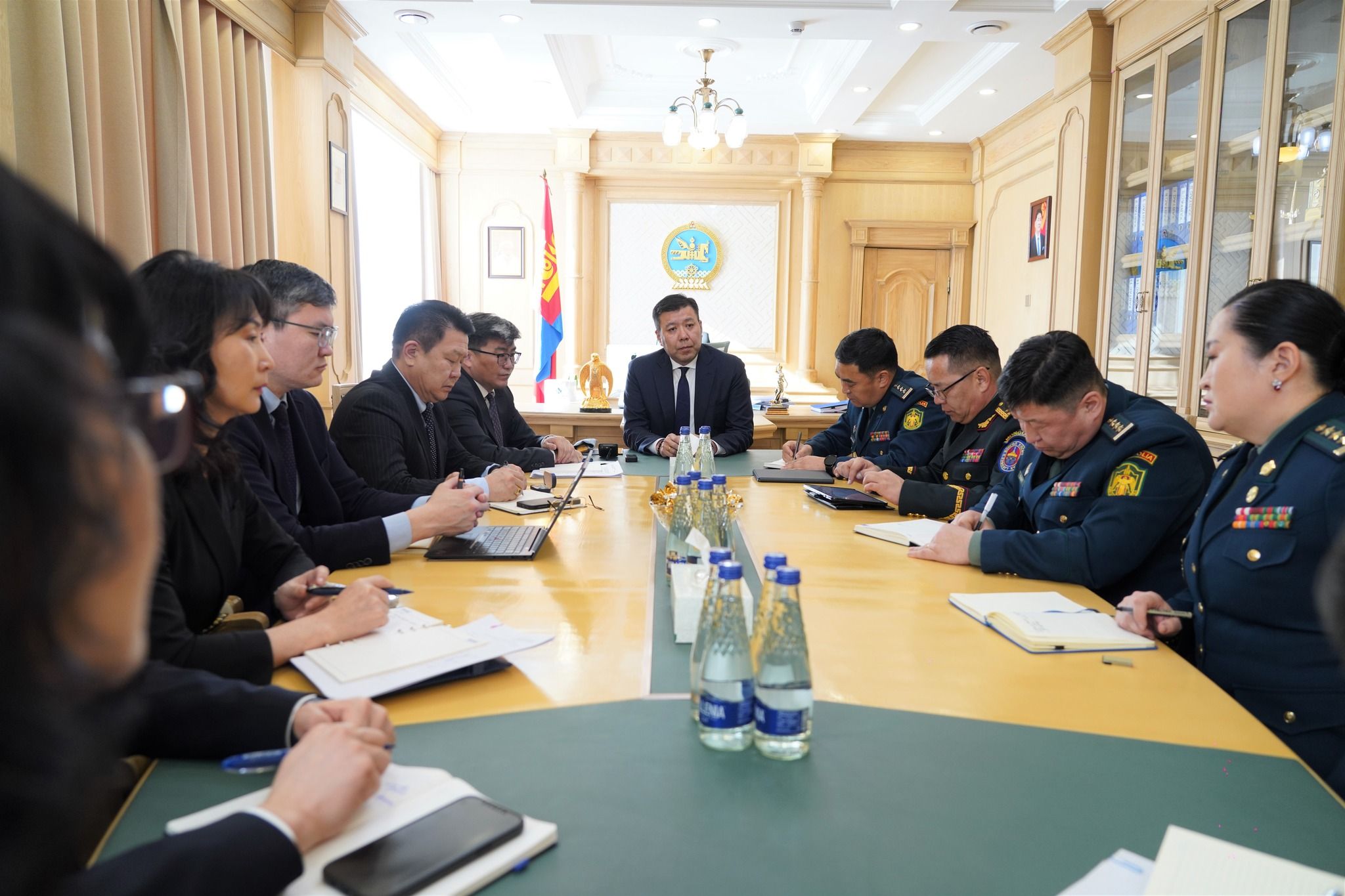 Хууль зүй, дотоод хэргийн сайд Б.Энхбаяр өнөөдөр (2026.02.16) Хил хамгаалах Ерөнхий газар (ХХЕГ)-ын шинээр томилогдсон Тэргүүн дэд дарга бөгөөд Хилийн цэргийн штабын дарга, хурандаа Ц.Мягмардорж, Захиргааны удирдлага эрхэлсэн дэд дарга, бригадын генерал Д.Мөнгөнжин, Ар тал, зэвсэглэл, инженер техник эрхэлсэн дэд дарга, хурандаа О.Азхүү болон Хяналт-шинжилгээ, үнэлгээ, дотоод аудит эрхэлсэн дэд дарга, хурандаа О.Сувд-Эрдэнэ нарыг хүлээн авч уулзан үүрэг, чиглэл өглөө.