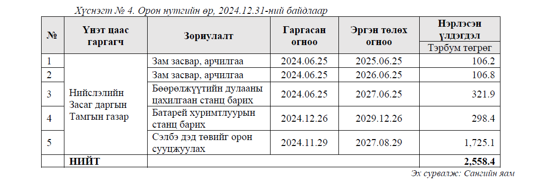 Засгийн газраас гадна орон нутгууд бонд гаргах эрх авч, нийслэл 500 сая ам.долларын бонд гаргасан. Энэ онд ч нийслэл нэмж 200 гаруй сая ам.долларын бонд босгох эрхийг УИХ-аас авсан. Харин өмнө нь авсан 500 сая ам.долларын бондын эргэн төлөлт 2026, 2027, 2029 онуудад хийнэ.