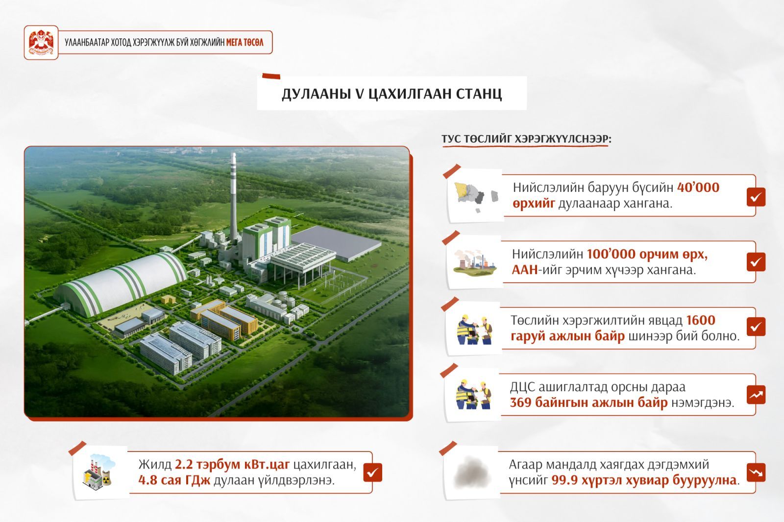 Улаанбаатар хотын өсөн нэмэгдэж буй эрчим хүчний хэрэглээг тэнцвэржүүлэх зорилгоор нийслэлээс Дулааны тавдугаар цахилгаан станцыг барихаар төлөвлөсөн. Өнөөдрийн байдлаар төслийн талбайн геодезийн 142 цооног өрөмдлөгийн ажлыг дуусгажээ. Ирэх дөрөвдүгээр сард станцын барилга угсралтын суурийн ажлыг эхлүүлэх юм.