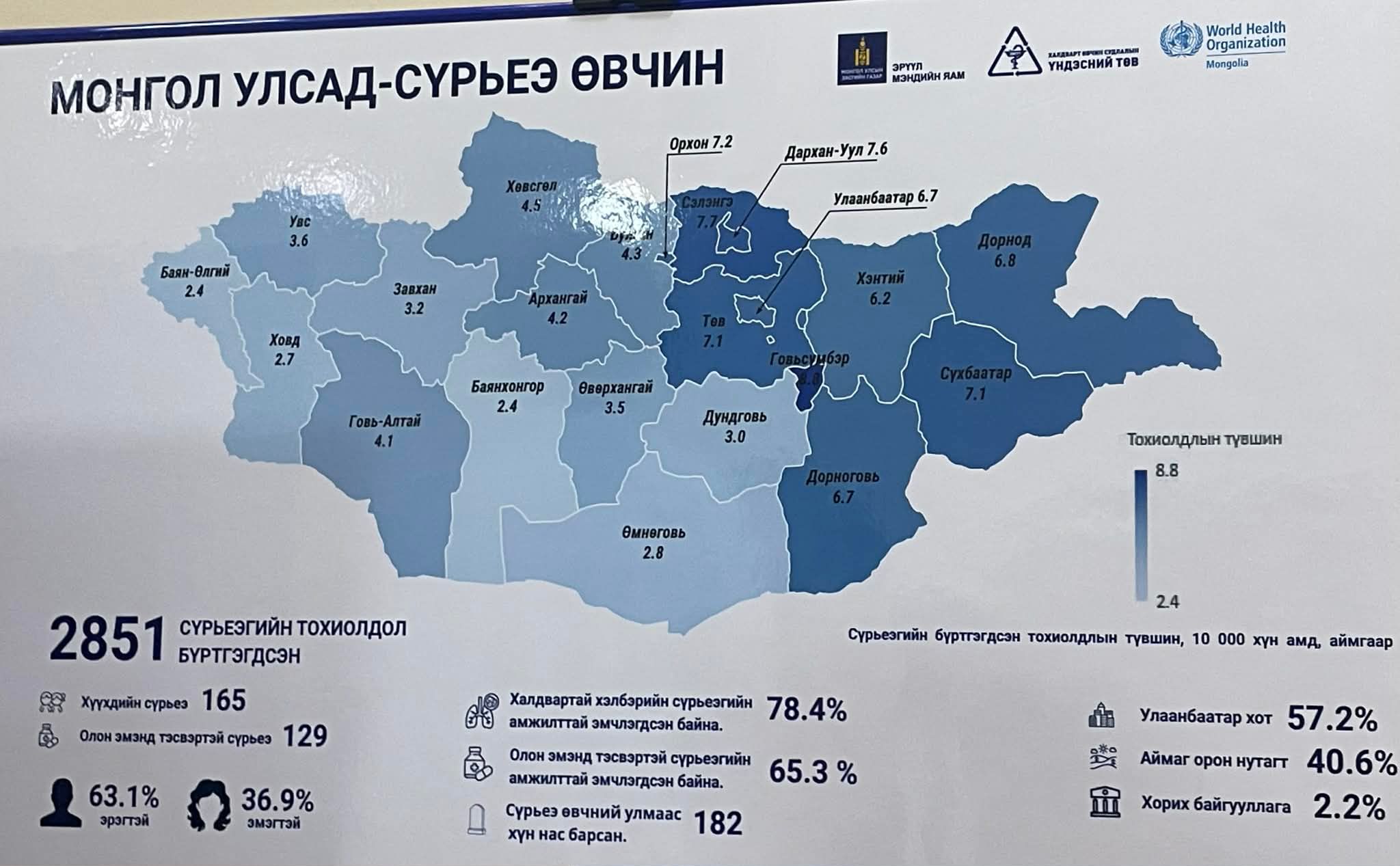 Монгол Улсын хэмжээнд 2025 оны байдлаар нийт 2851 сүрьеэгийн тохиолдол бүртгэгдсэн байна. Үүнээс хүүхдийн сүрьеэгийн 165 тохиолдол, олон эмэнд тэсвэртэй сүрьеэгийн 129 тохиолдол бүртгэгдсэн ба 65.3 хувь нь эмчлэгджээ. 2025 оны байдлаар улсын хэмжээнд сүрьеэ өвчний улмаас 182 хүн нас барсан байна. Өвчлөл хамгийн өндөр Говьсүмбэр, Сэлэнгэ, Дархан-Уул, Орхон, Төв аймгууд байгаа юм.