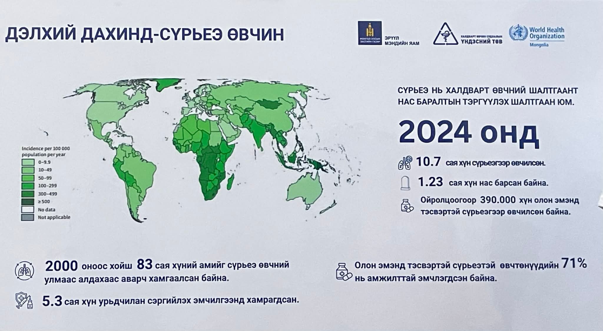 Эрүүл мэндийн сайд Ж.Чинбүрэн: Дэлхий дахинд халдварт өвчний шалтгаант нас баралтын дээгүүр бичигдэж байгаа шалтгааны нэг нь сүрьеэ өвчин байдаг. ДЭМБ-аас 2030 он гэхэд “Сүрьеэгүй дэлхий” болгох зорилго тавьж, олон үйл ажиллагаа явуулж байна.