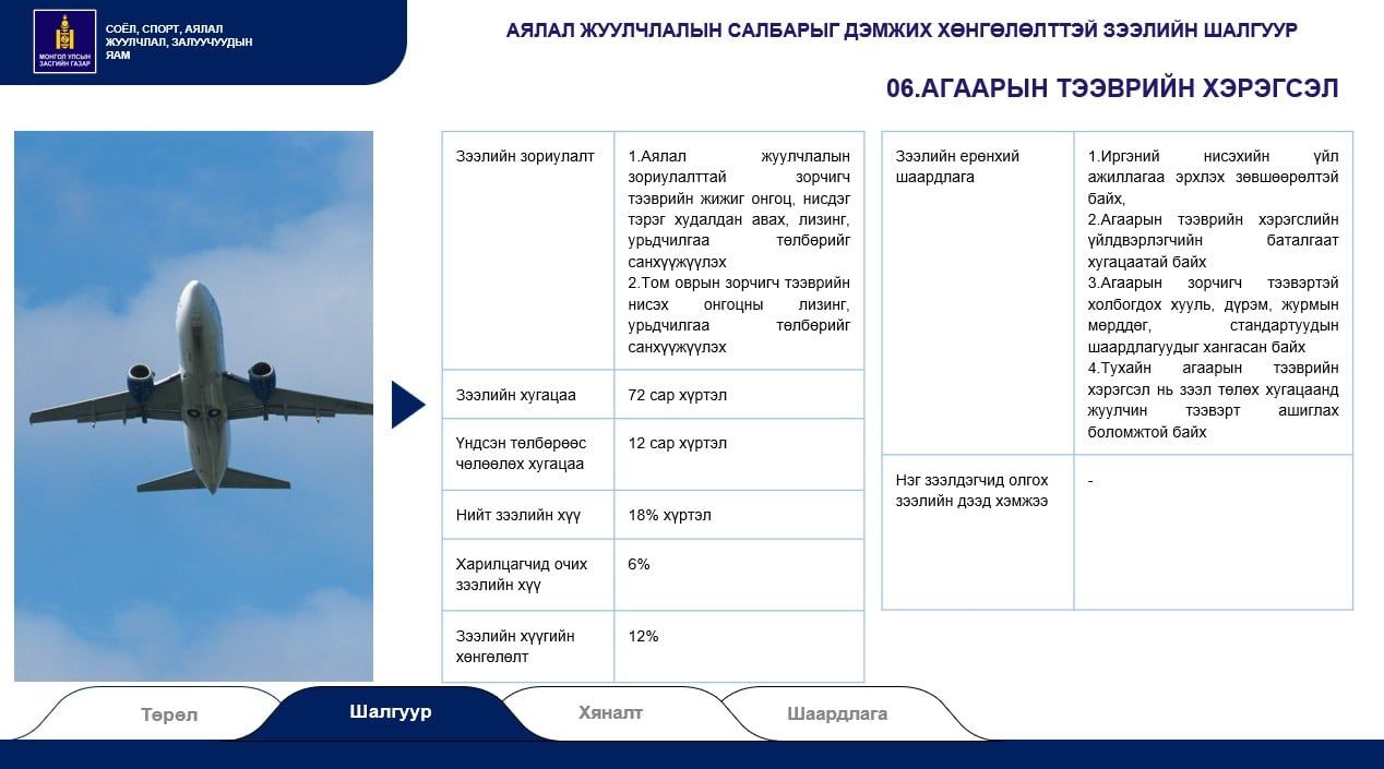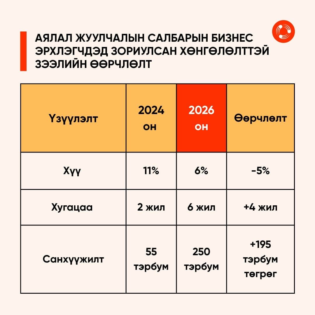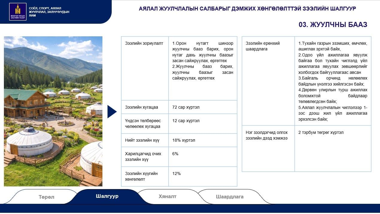 Аялал жуулчлалын чиглэлээр үйл ажиллагаа явуулдаг иргэн, аж ахуйн нэгж, байгууллагуудыг дэмжих, бүтээгдэхүүн үйлчилгээг сайжруулахад зориулан хөнгөлөлттэй зээлийг өмнө нь олгож байсан. Засгийн газраас 2024 онд 55 тэрбум төгрөгийн 24 сарын хугацаатай зээлийг арилжааны 12 банкаар олгож байв. Гэвч уг зээлийн шаардлага өндөр, эргэн төлөлтийн хугацаа бага байсан учраас аж ахуй нэгжүүд тэр бүрчлэн зээлд хамрагдаж чадаагүй. Нийт бизнес эрхлэгчдийн 50 орчим хувь нь зээл авсан байна. Харин энэ удаагийн зээлийн санхүүжилт нь 250 тэрбум төгрөг бөгөөд хугаа урт, хүү бага, шаардлага нь харьцангуй зөөлөн гэдгээрээ онцлог аж.