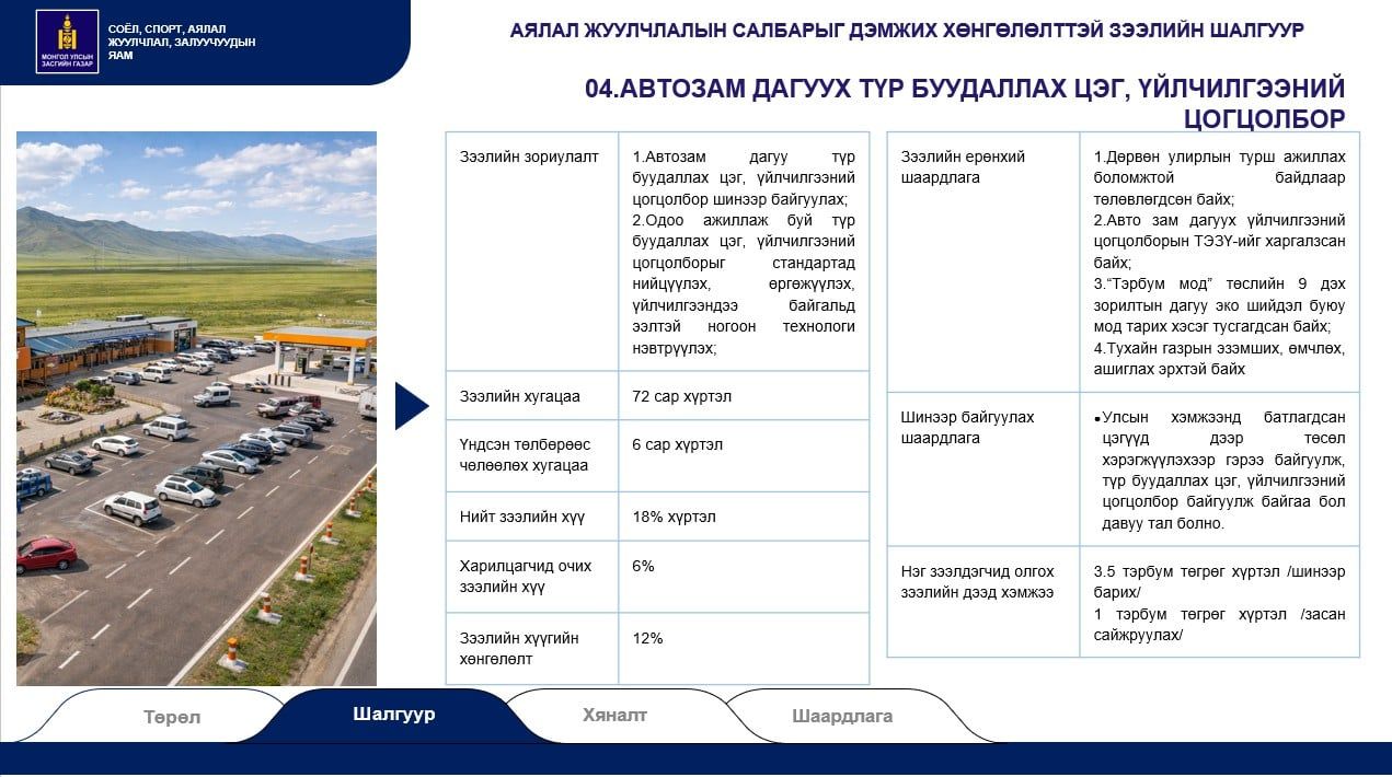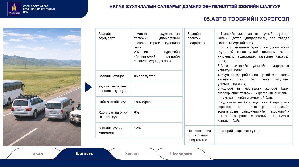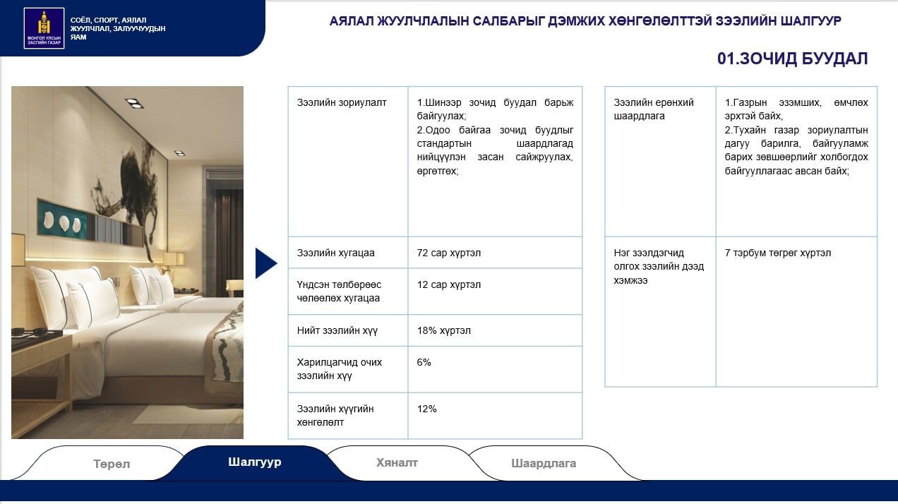 Хөнгөлөлттэй зээлийг зочид буудал, аялал жуулчлалын цогцолбор, жуулчны бааз, автозам дагуух түр буудаллах цэг, үйлчилгээний цогцолбор, авто тээврийн болон агаарын тээврийн хэрэгсэл гэсэн зургаан төрөлд олгоно. Тодруулбал, түр буудаллах цэг буюу Урьхан шиг газруудыг нэмэгдүүлнэ. Мөн жуулчдыг авч ирж буй агаарын тээврийн салбарт тодорхой дэмжлэг үзүүлэхээр авиа компаниудад зээл олгохоор болсон байна. тавигдаж буй шаардлага нь 2024 оныхтой харьцуулахад хэд хэдэн ялгаатай байна.