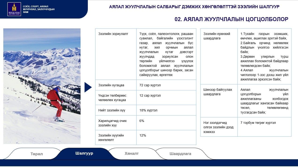Монгол Улсыг зорин ирэх жуулчдын тоо жил ирэх тутам нэмэгдэж, салбарын өсөлт эрчимжиж байна. 2026 оны гуравдугаар сарын эхний хагасын байдлаар манай улсад 101,549 жуулчин ирсэн нь хоёр жилийн өмнөх мөн үеийнхээс 140 хувиар өссөн үзүүлэлт аж. Төрөөс энэ салбарыг хөгжүүлж, дотоодын эдийн засагт оруулж буй хувь нэмрийг илүү нэмэгдүүлэхээр зорьж буй. Ингэхдээ бааз, аялал жуулчлалын цогцолборуудыг зөвхөн зуны улиралд бус дөрвөн улиралд жигд ажиллах боломжийг нээнэ. Энэ хүрээнд аялал жуулчлалын салбарт бизнес эрхэлж буй иргэн, аж ахуй нэгжид 6.0 хувийн хүүтэй, зургаан жилийн хугацаатай зээлийг олгож эхэллээ.