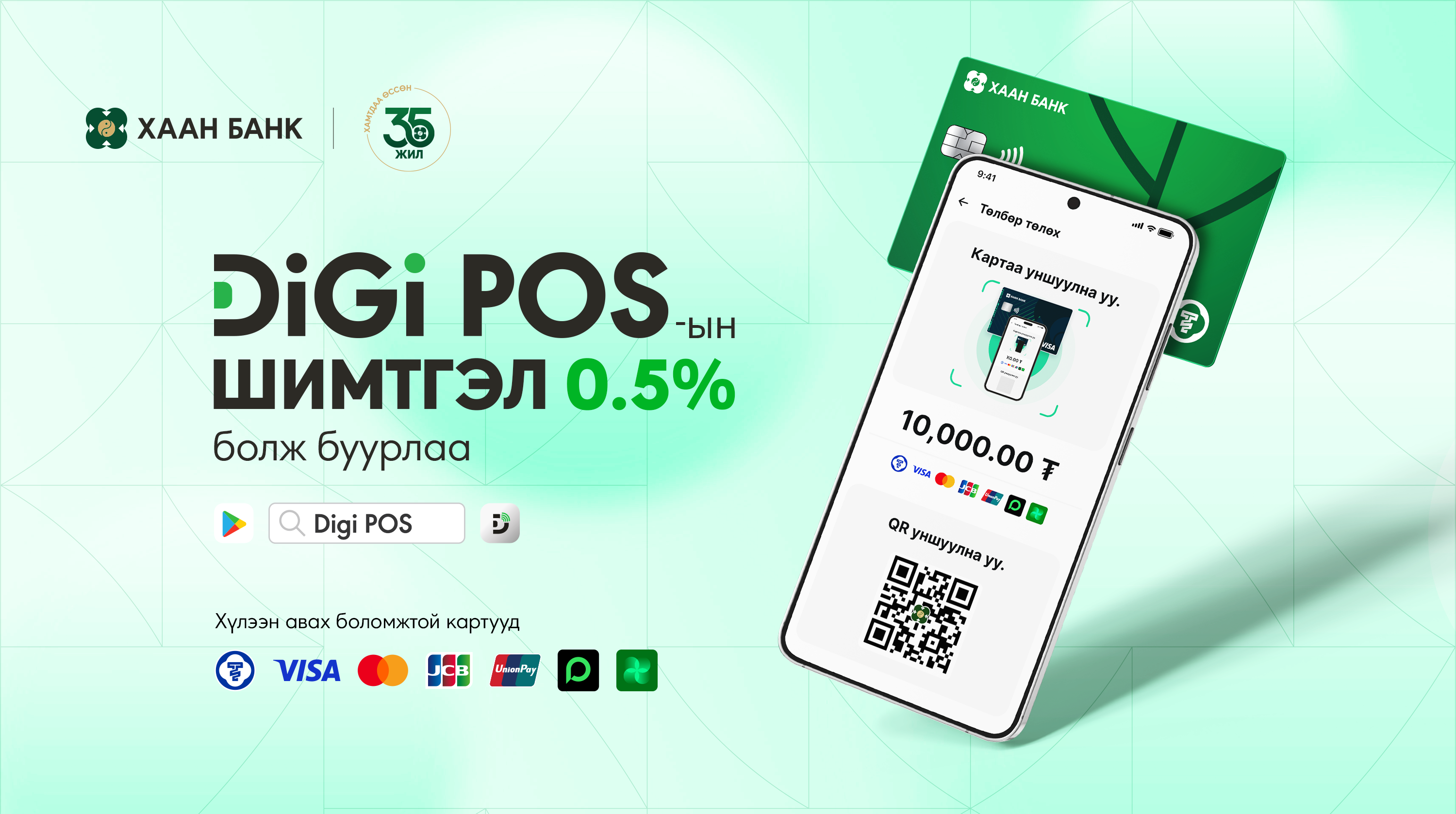 Дотоодын банкуудын картыг хаана ч хэзээ ч гар утсан дээр унших боломжтой, олон давуу тал олгож буй энэхүү цахим ПОС буюу DiGi POS-ын шимтгэл 0.8%-иас 0.5% болж буурсныг худалдаа үйлчилгээний бизнес эрхлэгч харилцагчдадаа дуулгахад таатай байна.