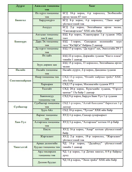 Улаанбаатар хотод 2020.12.01-2020.12.10-ны өдрийг дуустал 09:00-16:00 цагийн хооронд ажиллах тооцооны төвүүд: