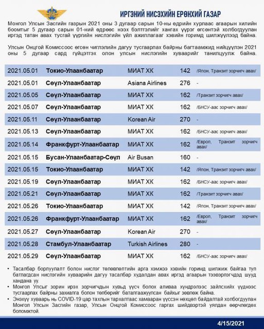Монгол Улс тавдугаар сарын 1-нээс агаарын хилээ нээж, олон улсын нислэгүүдийг хүлээн авах бэлтгэлийг хангах Ажлын хэсэг байгуулан ажиллаж байгаа юм. Мөн энэ хүрээнд тусгай үүргийн нислэгийн энгийн горимд шилжүүлж, олон улсын нислэг үйлдэх хуваарийг ИНЕГ-аас баталсан байна.