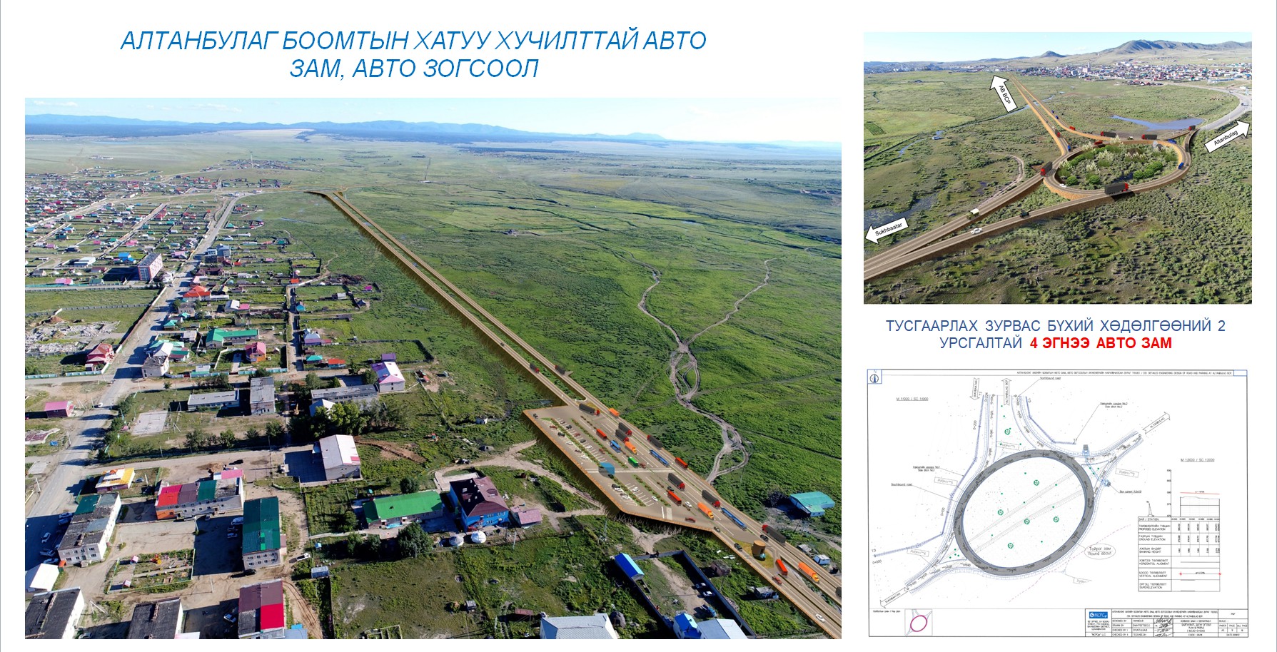 Одоогоор зураг төсөл, ТЭЗҮ нь батлагдан төслийн эхний бүрэлдэхүүн хэсгийг хангах ажил эхэлсэн байв. Хамгийн сайшаалтай нь Алтанбулаг боомтын авто замын урсгалыг ойролцоохь суурьшлын бүсээс тусгаарласан 1,7км хатуу хучилттай замыг барьж байгуулах ажил эхэлжээ. Учир нь боомтоор хийгдэх гадаад худалдааны эргэлт нэмэгдэхийн хэрээр авто замын нэвтрүүлэх чадал хүрэлцэхгүй болж үйлчлүүлэгчдэд хүндрэл учруулахын дээр Алтанбулаг сумын иргэд, хүүхдүүд зам тээврийн осолд өртөх нь ихсэж байгаа тул үүнээс сэргийлэн хийж буй арга хэмжээ аж. Мөн боомтын авто зогсоолын 7,000м2 талбай болон дотор замын 30,000м2 талбайд хатуу хучилт хийх юм. Алтанбулаг боомтод үүсдэг авто машины зохиомол дараалал нь транзитив тээвэр болон иргэдийн зорчих урсгал нэг байдагтай холбоотой аж. Тиймээс үүнийг шийдвэрлэхийн тулд дөрвөн тусдаа транзит, экспорт, импорт болон зорчигчийн авто замын урсгалыг барьж бий болгох юм. Ингэснээр иргэдэд маш чирэгдэлгүй хурдан шуурхай үйлчлүүлэх боломж бүрдэж, Монгол Улсад зорчих гаднын иргэдэд хүрэх анхны сэтгэгдэлд хүртэл сайнаар нөлөөлөх өндөр ач холбогдолтой.