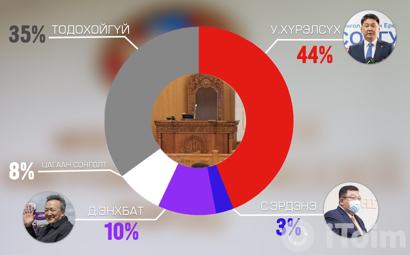 Судалгаанд оролцсон нийт иргэдийн 44 хувь МАН-аас нэр дэвшигч У.Хүрэлсүхийг дэмжсэн бол гурван хувь нь АН-аас нэр дэвшигч С.Эрдэнийг, 10 хувь нь "Зөв хүн электорат" эвслээс нэр дэвшигч Д.Энхбатыг, 8 орчим хувь нь цагаан сонголт хийнэ, 35 хувь сонголтоо хараахан хийж амжаагүй байна гэсэн судалгааны үр дүн гарчээ.