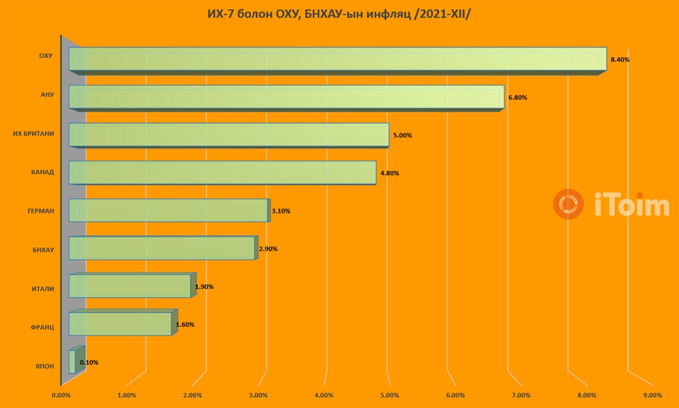 Манай урд хөршийн жилийн инфляцын өсөлт өнгөрсөн онд 2.9 хувьтай гарсан бол хойд хөршид өргөн хэрэглээний барааны үнийн өсөлт 8.4 хувь буюу “ИХ-7” болон БНХАУ, ОХУ гэх бүлэг дунд хамгийн өндөр байна.