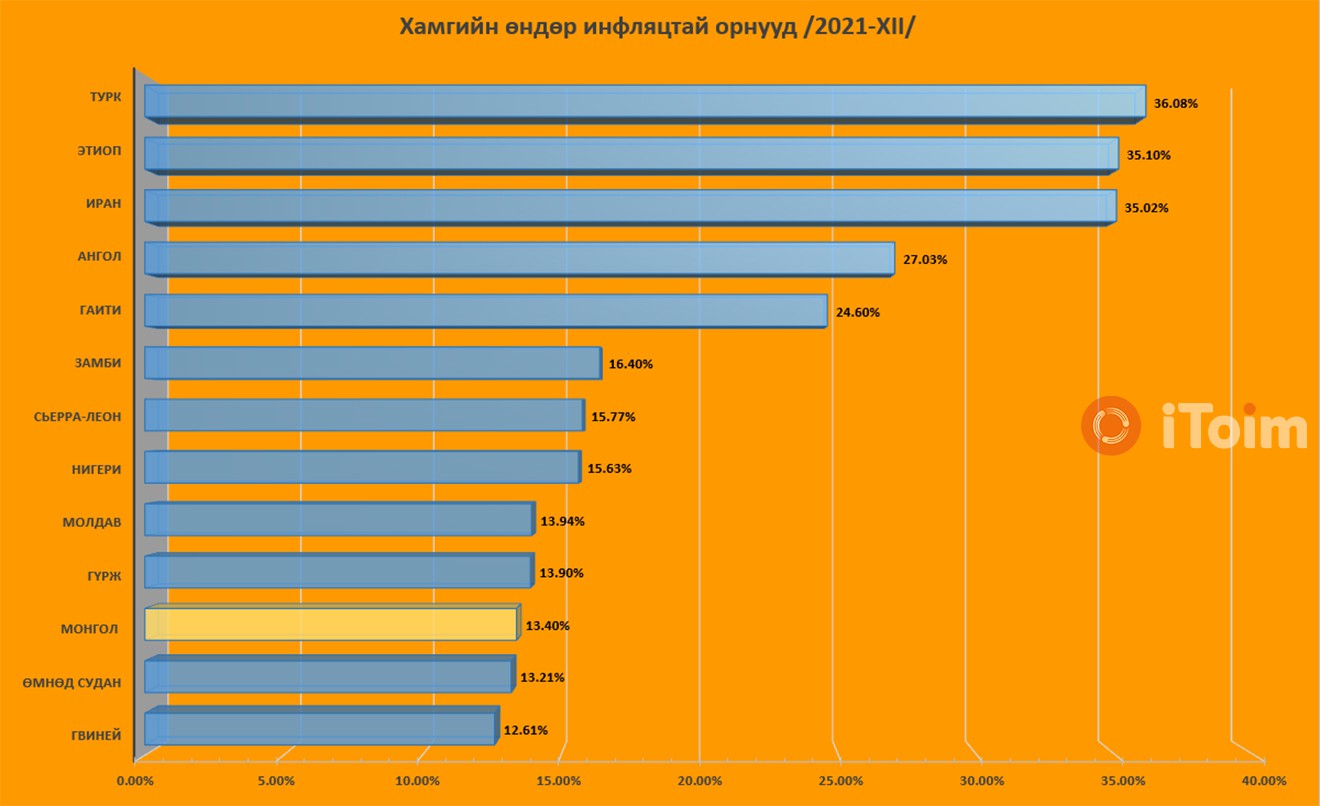 Харин эдгээр долоон улсыг оруулаад манай улс дэлхийн хамгийн өндөр инфляцтай 20 оронд багтаж байгаа юм.