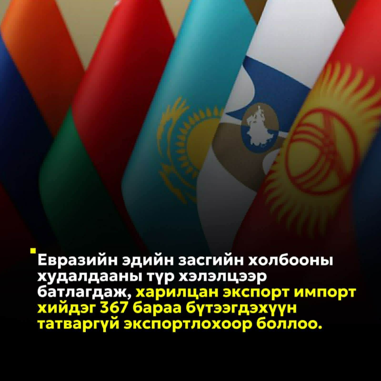 Засгийн газраас энэ оны арваннэгдүгээр сард УИХ-д өргөн мэдүүлсэн Монгол Улс болон Евразийн эдийн засгийн холбоо, түүний гишүүн орнууд хоорондын худалдааны түр хэлэлцээрийг баталлаа. Ингэснээр харилцан экспорт, импорт хийдэг 367 бараа бүтээгдэхүүнийг татваргүй экспортлох боломж бүрдлээ. Евразийн эдийн засгийн холбооны орнуудаас 367 нэр төрлийн Монгол Улсад үйлдвэрлэдэггүй хүнсний бүтээгдэхүүн болон хүнд машин, механизм, тоног төхөөрөмж, химийн бордоо, азотын бордоо импортоор авна. Үр дүнд нь уул уурхайн бус экспорт, ажлын байр, эдийн засгийн идэвхжил нэмэгдэхээр байна. Энэхүү хэлэлцээр нь хөрөнгө оруулалт, үйлчилгээний худалдаа, банк санхүү, төлбөр тооцоо зэрэг асуудлыг тусгаагүй, зөвхөн 367 барааны хүрээнд тохиролцжээ. Гаалийн байгууллагуудын хамтын ажиллагаа эрчимжиж, шуурхай байдлыг ханган, гадаад худалдаанд гарсан хүндрэл бэрхшээлийг шийдэх, зардлыг бууруулах зэрэг давуу тал энэ хэлэлцээр хэрэгжсэнээр гарах юм.