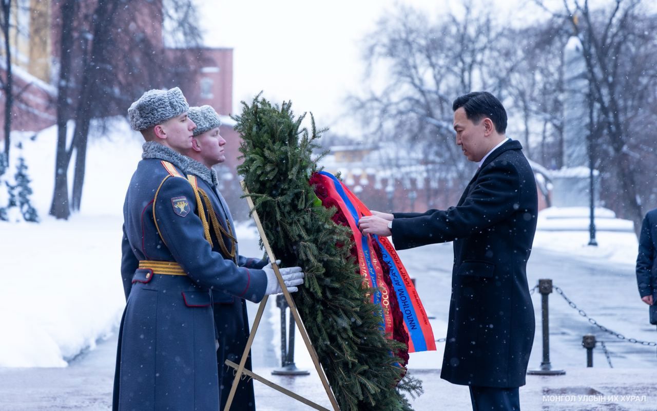 Улсын Их Хурлын дарга Н.Учрал тэргүүтэй ОХУ-д албан ёсны айлчлал хийж буй Монголын парламентын төлөөлөгчид өнөөдөр (2026.02.10) Москва хотын Александрын цэцэрлэгт хүрээлэн дэх “Нэр үл мэдэгдэх цэргийн хөшөө”-нд цэцэг өргөлөө. Цэцэг өргөх ёслолд Монголын талын албан ёсны төлөөлөгчдийн хамт ОХУ-ын Холбооны Хурлын Төрийн Думын орлогч дарга А.В.Гордеев оролцов.
